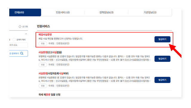 - 서비스 검색 및 선택: 검색창에 '폐업사실증명'을 입력하고 검색 결과에서 해당 서비스를 선택합니다.