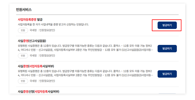 - 증명서 발급 메뉴 선택: 검색창에 '사업자등록증명'을 입력하여 '사업자등록증명 발급' 민원서비스에서 '발급하기'를 선택합니다.