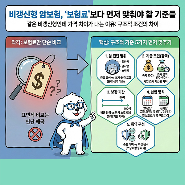 비갱신형 암보험에서 보험료 차이는 우연이 아닙니다. 암 진단 범위, 지급 조건, 보장 기간, 납입 방식, 특약 구성처럼 눈에 잘 드러나지 않는 조건 차이가 보험료로 나타날 뿐입니다.