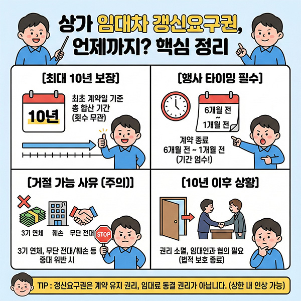즉, 1년 계약을 10번 갱신했든 2년 계약을 5번 했든 총 10년을 초과하면 갱신요구권은 더 이상 사용할 수 없습니다.