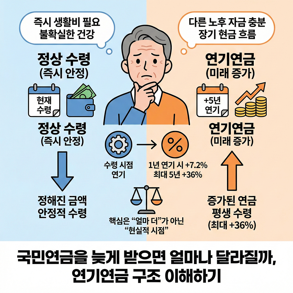 이런 상황에서는 연금액 증가 효과보다 연금을 받지 못하는 공백 기간의 부담이 더 크게 작용할 수 있습니다.