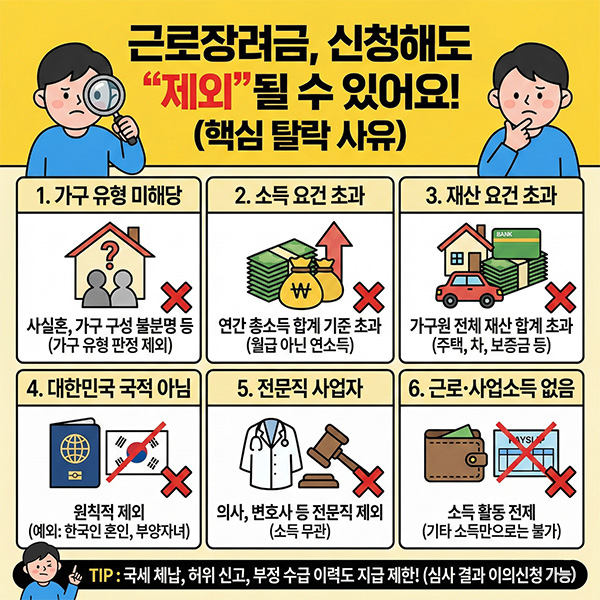 근로장려금 신청 대상에서 제외되는 경우는 단순히 소득이 많아서만 발생하지 않습니다.