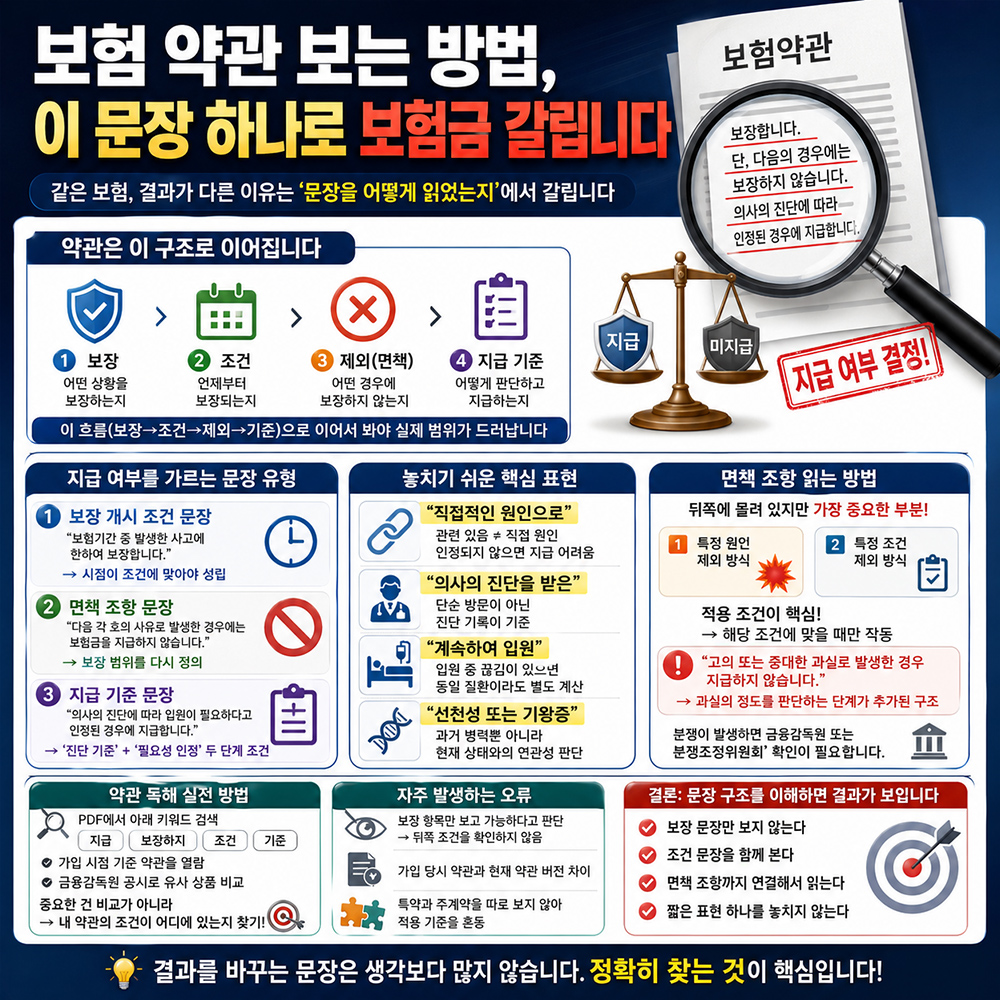 그래서 약관을 읽을 때는 한 항목만 보면 의미가 달라집니다. 항상 보장 → 조건 → 제외 → 기준 순서로 이어서 봐야 실제 범위가 드러납니다.