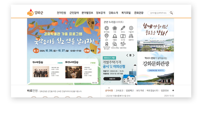 인천 강화군청 홈페이지에서는 주민등록 등본, 가족관계증명서 등 각종 증명서를 신청하고 발급받을 수 있습니다. 또한 공공근로 사업 및 기타 일자리 정보를 제공하며, 구직자들에게 유용한 정보를 제공합니다. 전자민원 서비스는 정부24와 연계되어 주민등록, 여권, 부동산, 자동차 관련 민원 등을 온라인으로 처리할 수 있습니다.