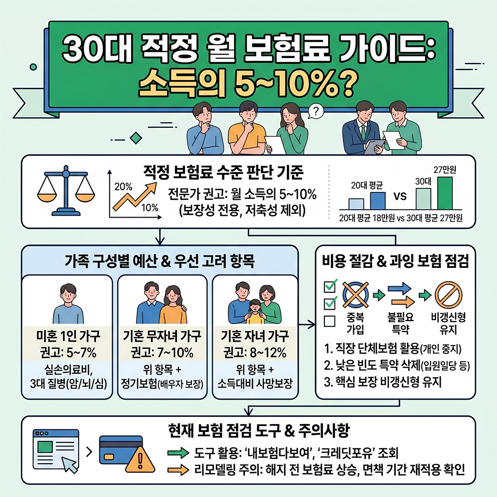 | 가족 구성 | 보험료 적정 범위(일반적 권고 기준) | 우선 고려 항목 |
