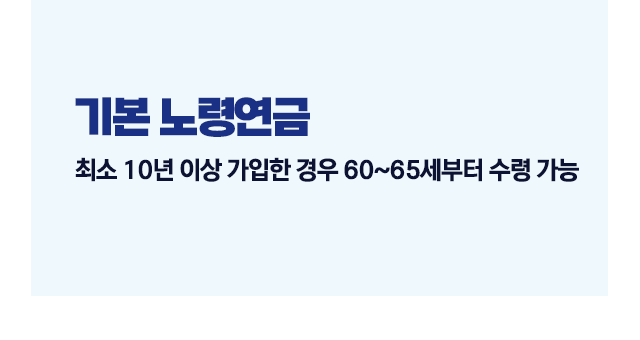 - 기본 노령연금: 최소 10년 이상 가입한 경우 60~65세부터 수령 가능