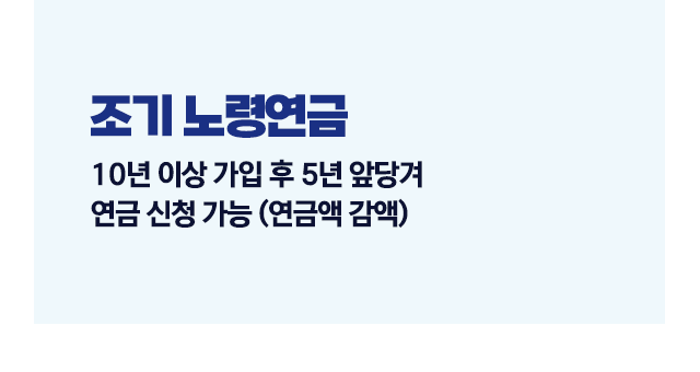 - 조기 노령연금: 10년 이상 가입 후 5년 앞당겨 연금 신청 가능 (연금액 감액)