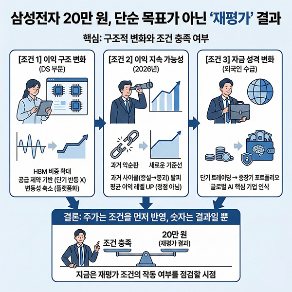 삼성전자 주가를 20만 원 관점에서 바라본다는 것은 단순한 낙관론이 아니라 기업의 이익 구조와 시장 평가 기준이 바뀌고 있는지를 묻는 과정입니다.