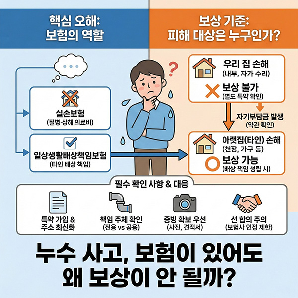 누수 사고에서 보험금 지급 여부는 보험 가입 유무보다 사고 성격과 배상 구조에 의해 결정됩니다.