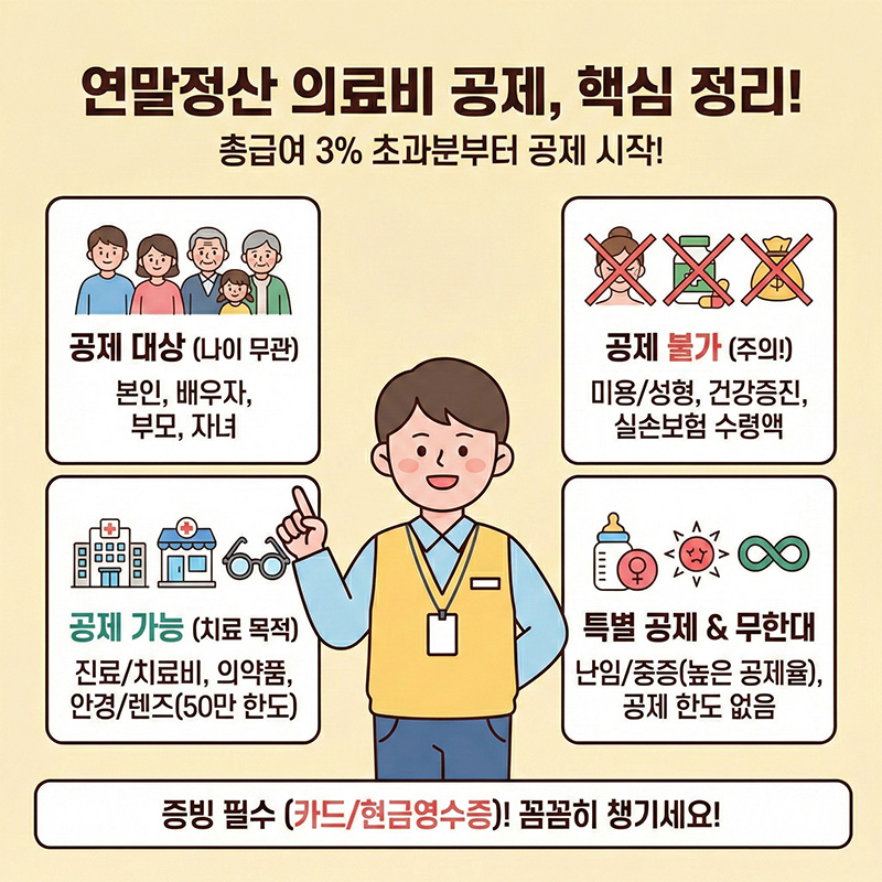 연말정산을 준비할 때 “이 병원비도 공제가 될까”, “누구 의료비까지 포함될까”처럼 의료비 공제 범위를 헷갈리는 경우가 많습니다.
